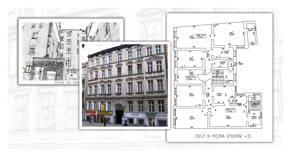Projekt budowlany odtworzenia przedwojennej zabudowy oraz modernizacja i rozbudowa budynku wielorodzinnego.